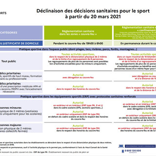 Tableau de déclinaison des décisions sanitaires pour le sport à partir du 20 mars 2021